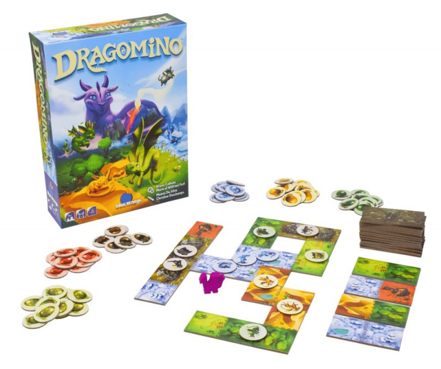 Dans Dragomino, les joueurs explorent des paysages variés à la recherche de précieux œufs de dragon. En assemblant astucieusement des dominos représentant différents environnements (forêts, montagnes, déserts...), vous tenterez de découvrir un maximum de bébés dragons cachés dans leurs œufs.